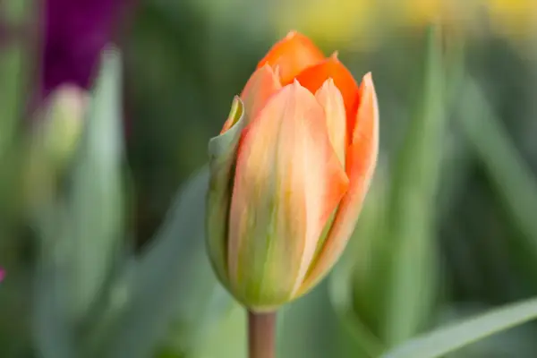 O lalea înaltă, elegantă, cu petale roz-portocaliu stropite cu galben la bază.